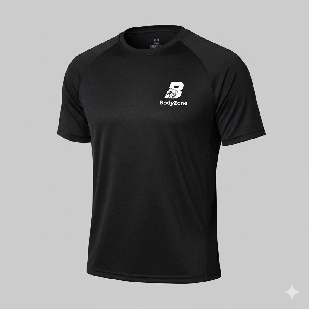 เสื้อออกกำลังกาย BodyZone สีดำ เนื้อผ้า Dry-Fit ระบายเหงื่อไว ทรงสวยพอดีตัว เคลื่อนไหวคล่องตัวทุุกองศา ทนทาน ใส่สบาย ไม่ร้อน